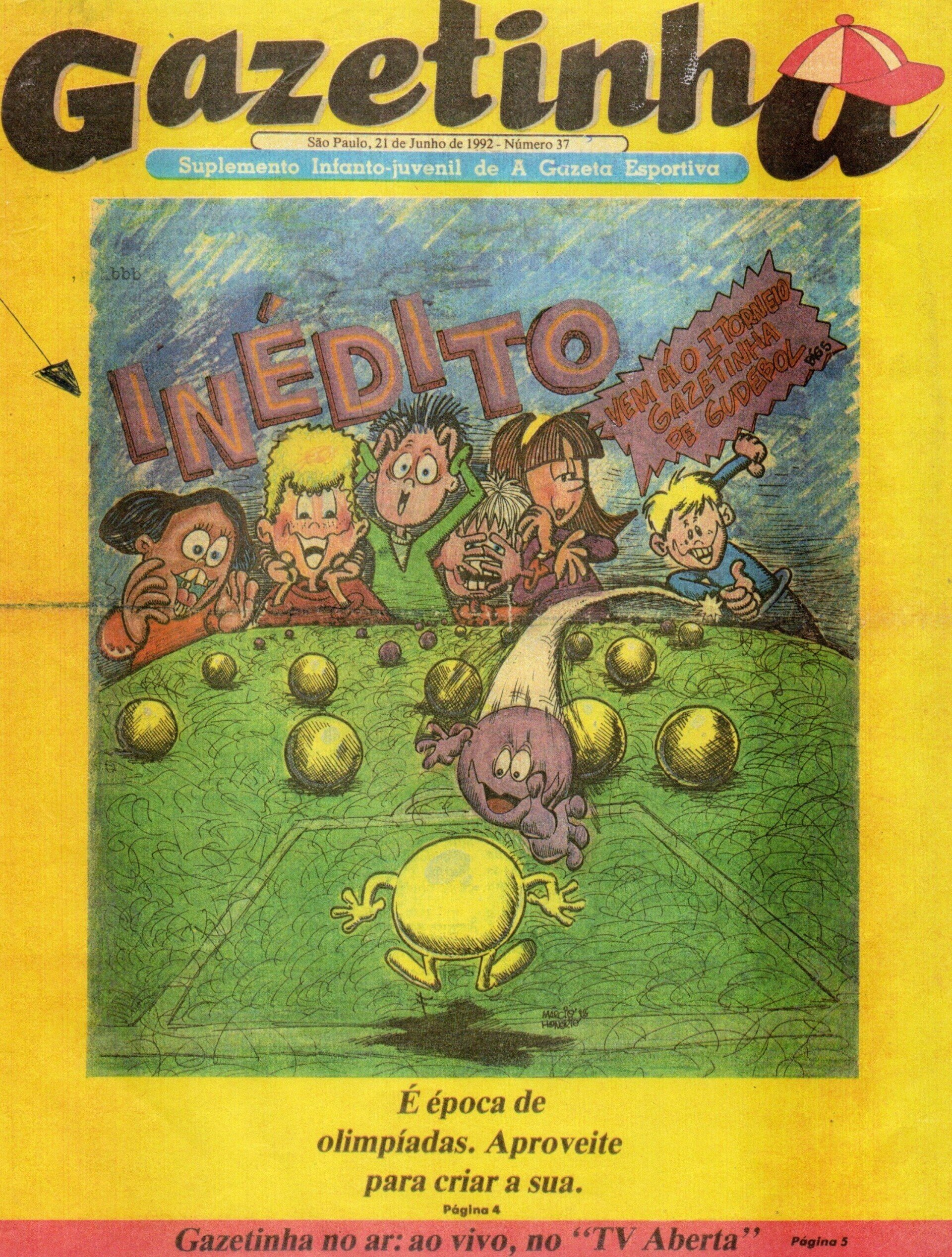 texto da capa "Inédito Vem ai o I Torneio Gazetinha de Gudbol. É época de olimpíadas. Aproveite para criar a sua"